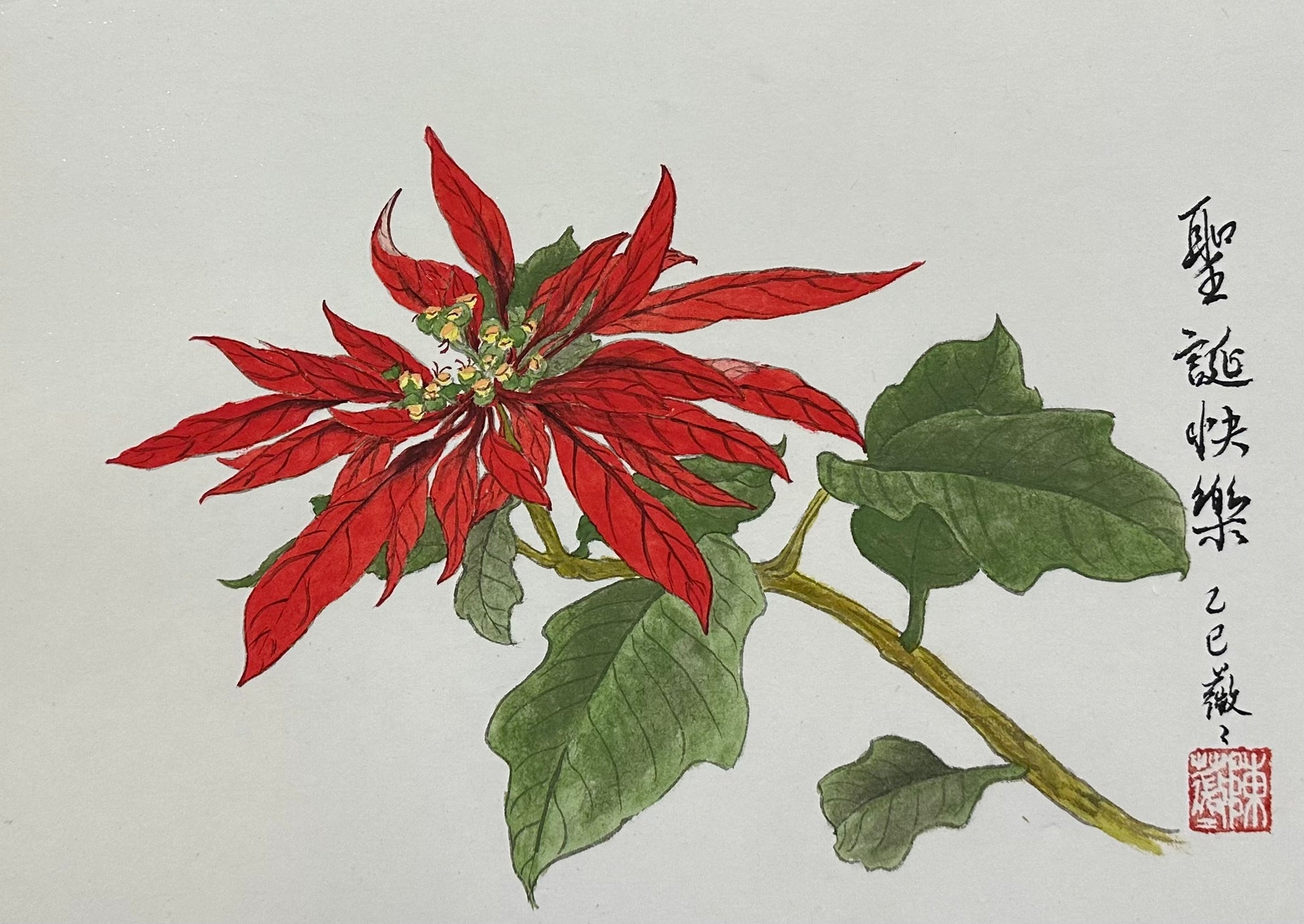 Inspired by a poinsettia masterpiece from Yu Zhizhen 俞致貞 (1915–1995)—the renowned female Gongbi master.